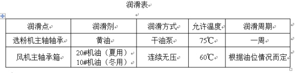 在日常運行中,應(yīng)保證各潤滑點充分潤滑,并定期對粉分離器內(nèi)軸承和風(fēng)機軸承進(jìn)行潤滑(見下表)。在日常維護(hù)中,注意粉體分離器轉(zhuǎn)子的平衡。如發(fā)現(xiàn)異常振動,應(yīng)立即停機檢查原因,并可在運行前繼續(xù)故障。